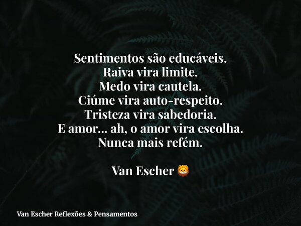 Sentimentos são educáveis. Raiva vira limite. Medo vira cautela. Ciúme vira auto-respeito. Tristeza vira sabedoria. E amor... ah, o amor vira escolha. Nunca mais refém. Van Escher 🦁