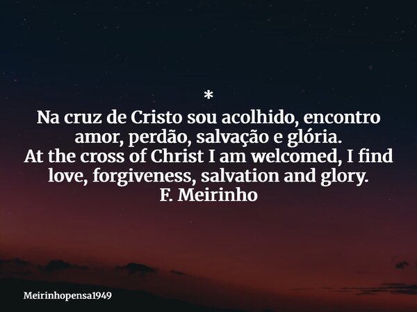 * Na cruz de Cristo sou acolhido, encontro amor, perdão, salvação e glória. At the cross of Christ I am welcomed, I find love, forgiveness, salvation and glory. F. Meirinho