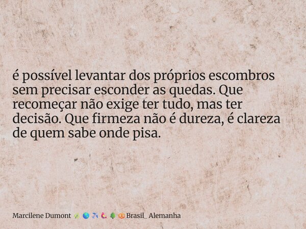 é possível levantar dos próprios escombros sem precisar esconder as quedas. Que recomeçar não exige ter tudo, mas ter decisão. Que firmeza não é dureza, é clareza de quem sabe onde pisa.