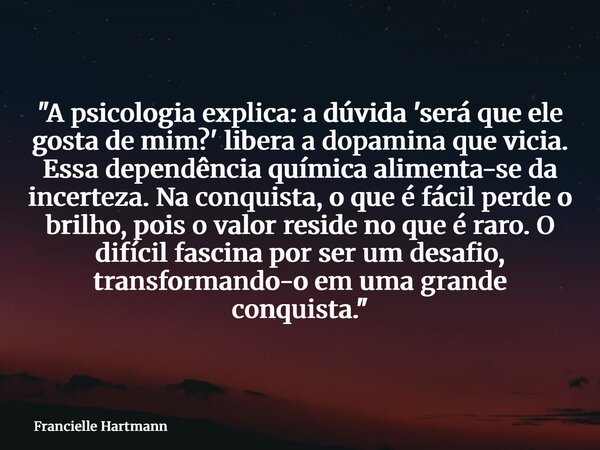 "A psicologia explica: a dúvida 'será que ele gosta de mim?' libera a dopamina que vicia. Essa dependência química alimenta-se da incerteza. Na conquista, o que é fácil perde o brilho, pois o valor reside no que é raro. O difícil fascina por ser um desafio, transformando-o em uma grande conquista."