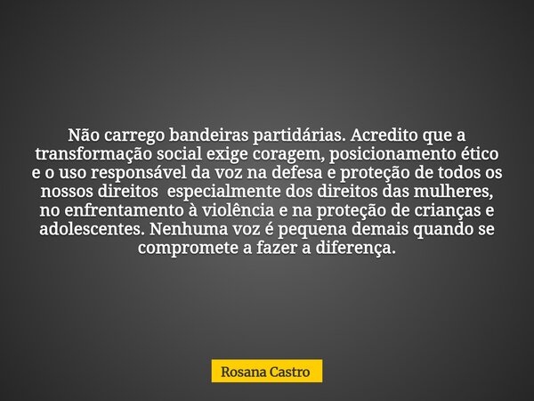 Não carrego bandeiras partidárias. Acredito que a transformação social exige coragem, posicionamento ético e o uso responsável da voz na defesa e proteção de todos os nossos direitos especialmente dos direitos das mulheres, no enfrentamento à violência e na proteção de crianças e adolescentes. Nenhuma voz é pequena demais quando se compromete a fazer a diferença.