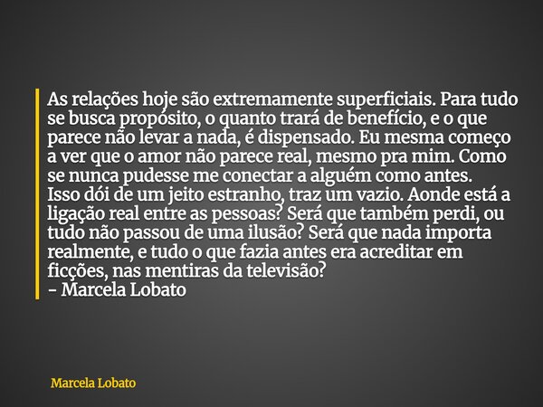 As relações hoje são extremamente superficiais. Para tudo se busca propósito, o quanto trará de benefício, e o que parece não levar a nada, é dispensado. Eu mesma começo a ver que o amor não parece real, mesmo pra mim. Como se nunca pudesse me conectar a alguém como antes.