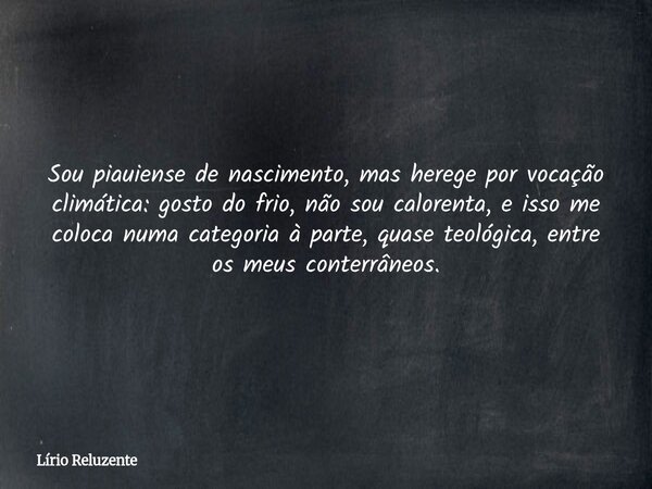 Sou piauiense de nascimento, mas herege por vocação climática: gosto do frio, não sou calorenta, e isso me coloca numa categoria à parte, quase teológica, entre os meus conterrâneos.