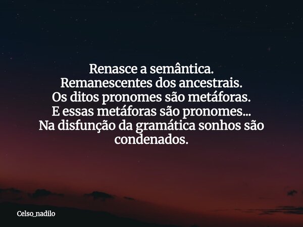 Renasce a semântica. Remanescentes dos ancestrais. Os ditos pronomes são metáforas. E essas metáforas são pronomes... Na disfunção da gramática sonhos são condenados.