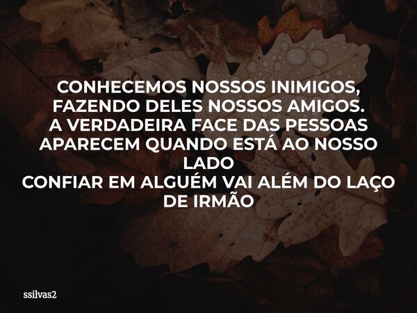 CONHECEMOS NOSSOS INIMIGOS, FAZENDO DELES NOSSOS AMIGOS. A VERDADEIRA FACE DAS PESSOAS APARECEM QUANDO ESTÁ AO NOSSO LADO CONFIAR EM ALGUÉM VAI ALÉM DO LAÇO DE IRMÃO