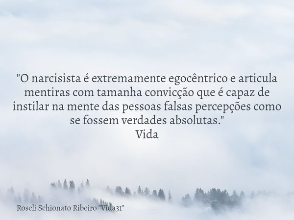 "O narcisista é extremamente egocêntrico e articula mentiras com tamanha convicção que é capaz de instilar na mente das pessoas falsas percepções como se fossem verdades absolutas." Vida