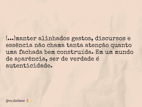 (...)manter alinhados gestos, discursos e essência não chama tanta atenção quanto uma fachada bem construída. Em um mundo de aparência, ser de verdade é autenticidade.