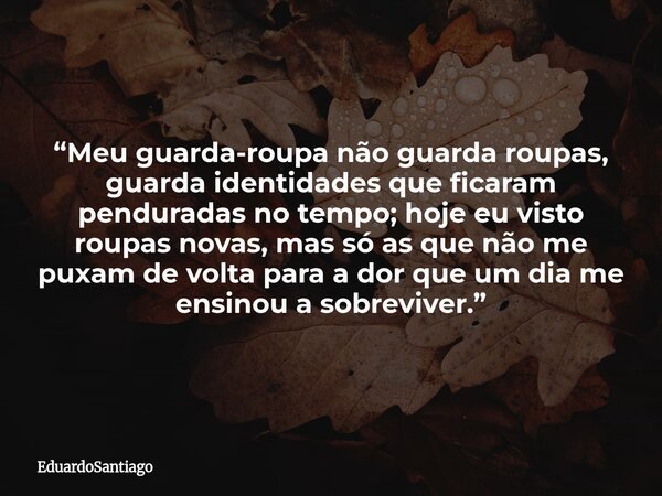 “Meu guarda-roupa não guarda roupas, guarda identidades que ficaram penduradas no tempo; hoje eu visto roupas novas, mas só as que não me puxam de volta para a dor que um dia me ensinou a sobreviver.”