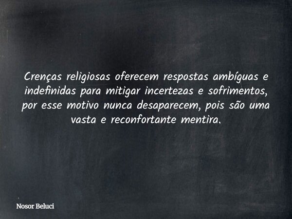 Crenças religiosas oferecem respostas ambíguas e indefinidas para mitigar incertezas e sofrimentos, por esse motivo nunca desaparecem, pois são uma vasta e reconfortante mentira.