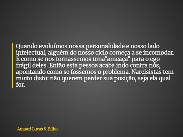 Quando evoluímos nossa personalidade e nosso lado intelectual, alguém do nosso ciclo começa a se incomodar. É como se nos tornassemos uma "ameaça" para o ego frágil deles. Então esta pessoa acaba indo contra nós, apontando como se fossemos o problema. Narcisistas tem muito disto: não querem perder sua posição, seja ela qual for.