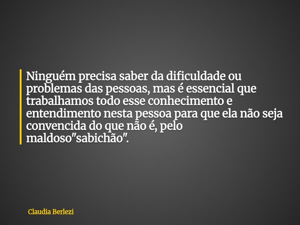 Ninguém precisa saber da dificuldade ou problemas das pessoas, mas é essencial que trabalhamos todo esse conhecimento e entendimento nesta pessoa para que ela não seja convencida do que não é, pelo maldoso "sabichão".